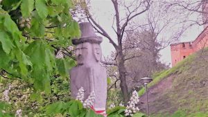 A tuż obok wszystkiemu przygląda się w zadumie replika Światowida. Oryginał jest w nieodległym Muzeum Archeologicznym. Nota bene także mają tam przepiękny ogród, przede wszystkim różany, a Światowid doczekał się znakomitego wyeksponowania. Ma własną salę, stoi na drewnianym pomoście i wszystko wokół niego wygląda jak w prasłowiańskim chramie. Bardzo ładna wystawa.